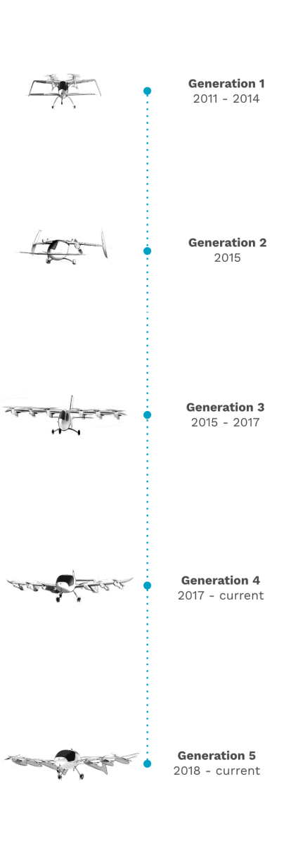 Since 2010, we’ve developed six generations of aircraft. Each new generation has built on key learnings from prior generations and furthers our mission to deliver safe, everyday flight for everyone. Learn about our previous aircraft, milestones, and the learnings that helped shape the development of our 6th Generation aircraft.